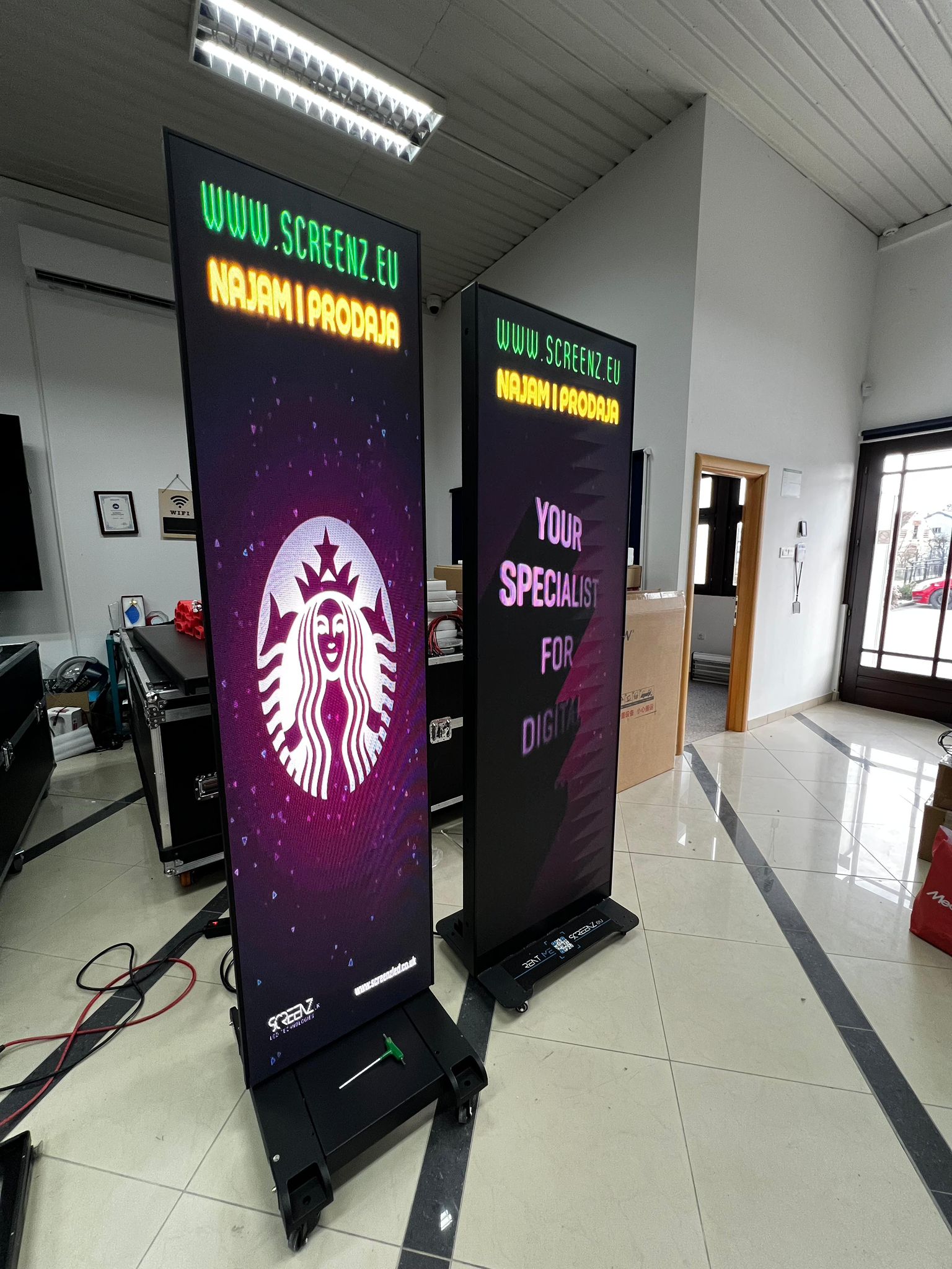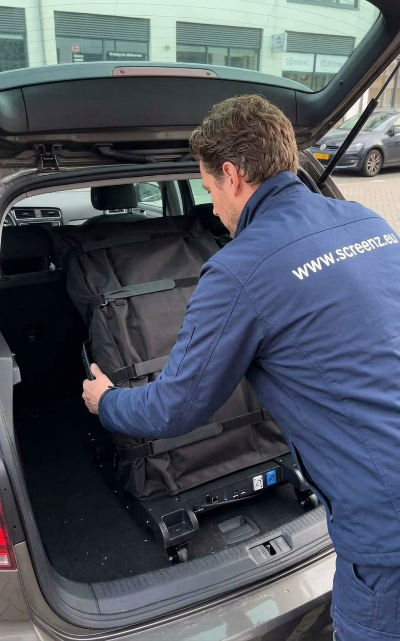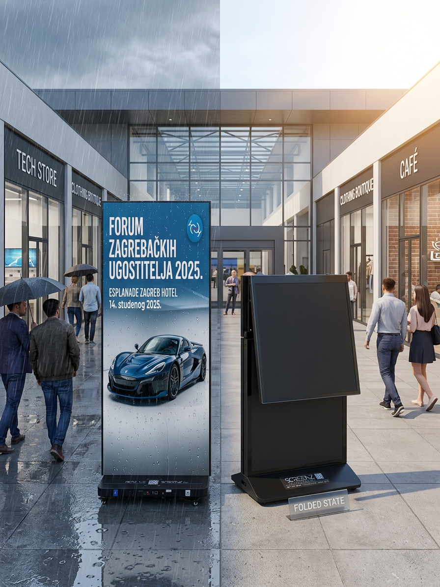 Sklopivi LED Poster – Screenz LED Technologies - Tražite reklamni LED display koji možete ponijeti u osobnom autu? Naš Sklopivi LED Poster jedino je takvo rješenje na tržištu koje kombinira impresivnu veličinu ekrana s izuzetnom prijenosnošću. Dimenzije i transport: - U radnom položaju: 50 x 200cm – visoki, uočljivi format koji privlači poglede - Složen za transport: samo 50 x 100cm – stane u prtljažnik svakog osobnog automobila - Zaboravite na kombi ili dostavno vozilo – ovaj LED poster ide kamo god vi idete. U kompletu dobivate: Svaki Sklopivi LED Poster dolazi s profesionalnom zaštitnom torbom koja štiti panel od udaraca i ogrebotina tijekom transporta. Jednostavno složite, stavite u torbu i krenite. Odmah dostupno: Više od 100 komada na lageru – nema čekanja, nema rokova isporuke. Vaš LED poster može biti kod vas već sutra. Postavljanje bez stručnjaka: Montaža traje svega nekoliko minuta. Upravljanje sadržajem vrši se putem aplikacije na mobitelu (Android i iPhone) – slike i videi se mijenjaju u realnom vremenu. Gdje se Sklopivi LED Poster koristi? – Eventagencije i organizatori događanja – Restorani, kafići i barovi – Hoteli i recepcije – Konferencije i kongresni centri – Ljekarne i zdravstvene ustanove – Sportski klubovi i teretane – Sajmovi i izložbe Dostupno za najam i prodaju. Kontaktirajte nas – više od 100 komada odmah dostupno!